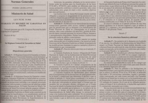 Plan de Acceso Universal con Garantías Explícitas (AUGE). Es promulgada la ley Nº 19.966, que instaura un régimen de garantías de salud a traves de un instrumento de regulación sanitaria