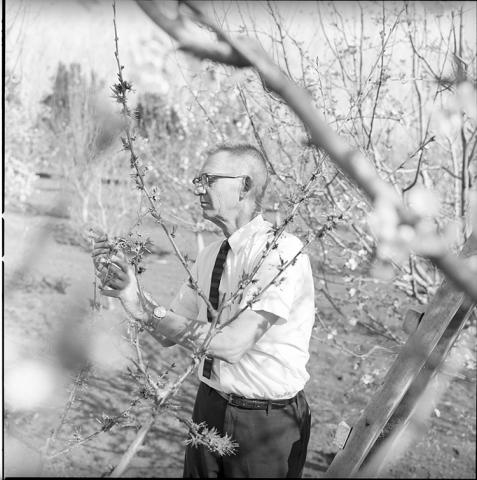 Agrónomo norteamericano polinizando duraznal (Programa de intercambio con CORFO, Rinconada de Maipú, 1968).