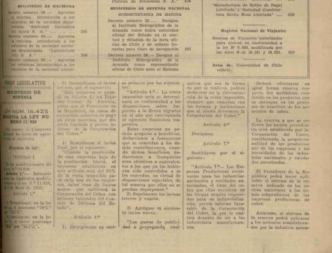 Chilenización del Cobre. Es promulgada la ley Nº 16.425, que determina la creación de sociedades mixtas con las empresas cupríferas extranjeras, donde el Estado concentraría 51% de la propiedad de los yacimientos.