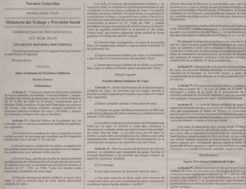 Reforma Previsional. Es promulgada la ley Nº 20.255, que crea un sistema de pensiones solidarias de vejez e invalidez financiado con recursos del Estado.