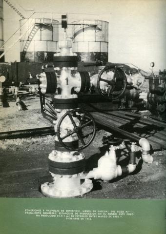 Conexiones y válvulas en superficie del pozo N1. Yacimiento Sombrero, estanques de producción en el fondo. Este pozo ha producido 64.411metros cuadrados de petróleo entre marzo de 1950 y diciembre de 1952.