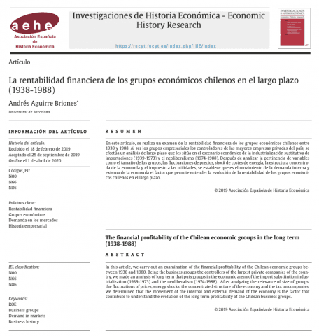 En este artículo, se realiza un examen de la rentabilidad financiera de los grupos económicos chilenos entre 1938 y 1988. Al ser los grupos empresariales los controladores de las mayores empresas privadas del país, se efectúa un análisis de largo plazo que les sitúa en el escenario económico de la industrialización sustitutiva de importaciones (1939-1973) y el neoliberalismo (1974-1988). Después de analizar la pertinencia de variables como el tamaño de los grupos, las fluctuaciones de precios, shock de costes de energía, la estructura concentra- da de la economía y el impuesto a las utilidades, se establece que es el movimiento de la demanda interna y externa de la economía el factor que permite entender la evolución de la rentabilidad de los grupos económi- cos chilenos en el largo plazo.