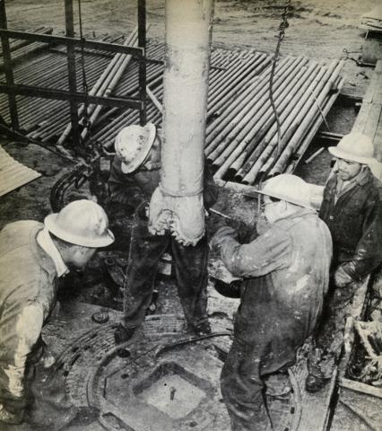 Obreros chilenos colocando un trépano para una faena de perforación.