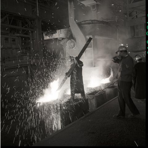 En la acería. Fundición de “tochos” (hombre entre chispas), años ‘60.
