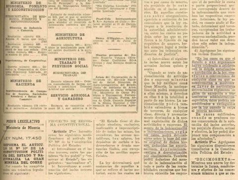Nacionalización del Cobre. Es promulgada la ley Nº 17.450, que aprueba la reforma constitucional que permitió la nacionalización de los yacimientos de la Gran Minería del Cobre en Chile.